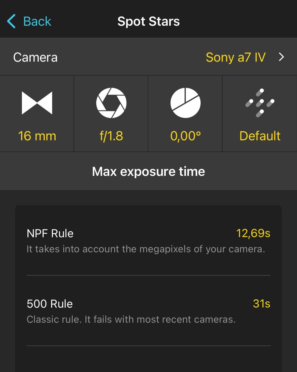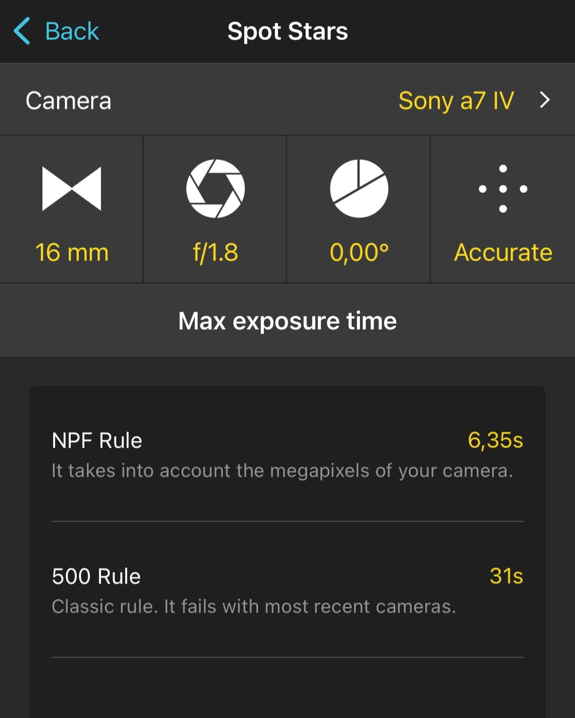- The PhotoPills app can calculate both rules for you. You can choose between "Default (barely noticeable trails)" and "Accurate (useful for large prints)" based on your desired quality.