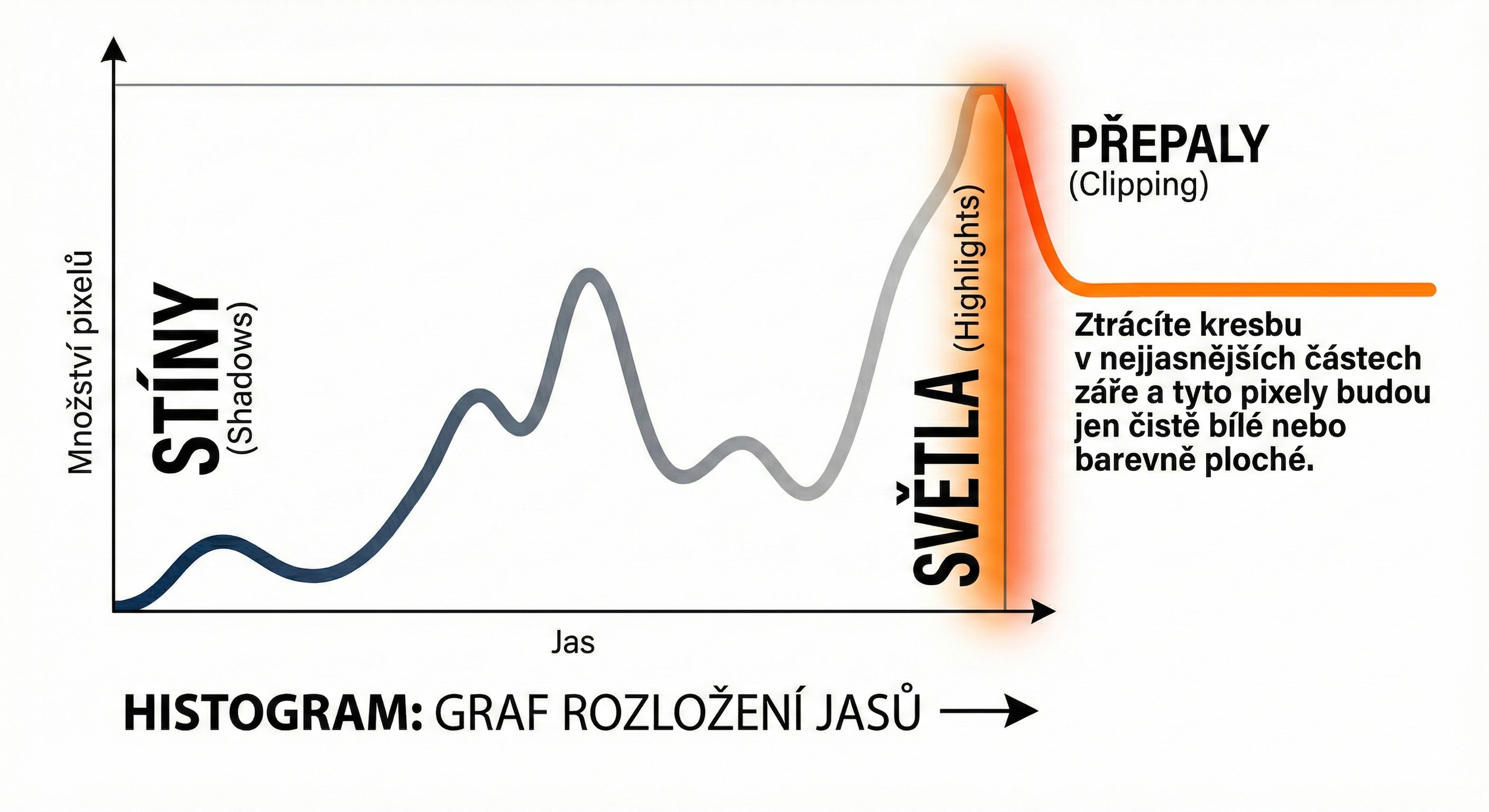 Pokud graf "narazí" do pravé stěny, dochází k přepalům (clipping). Ztrácíte kresbu v nejjasnějších částech záře a tyto pixely budou jen čistě bílé nebo barevně ploché.