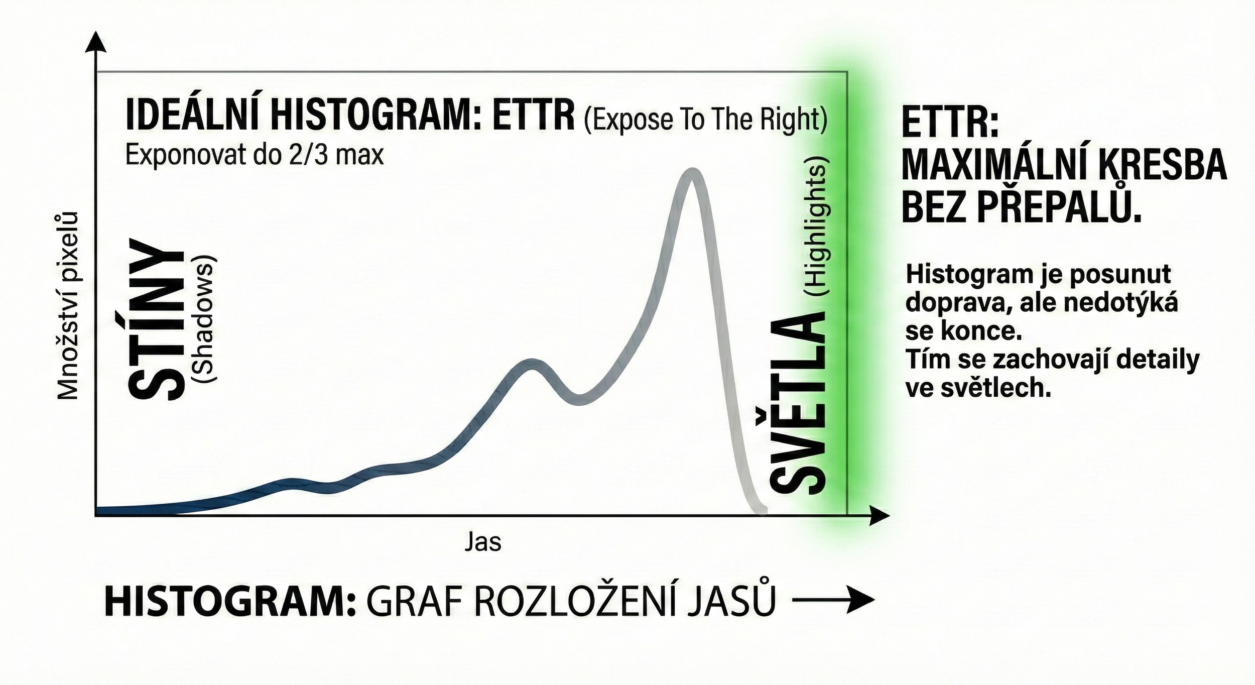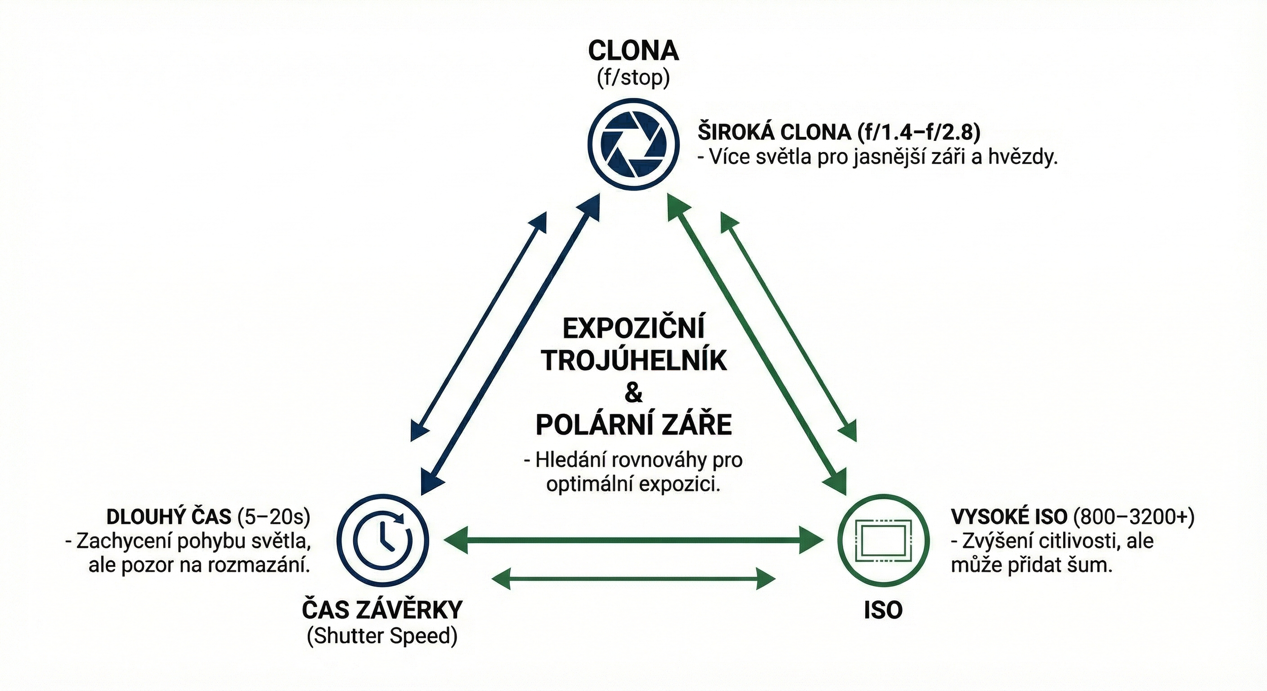 U noční krajiny s polární září vždy exponujeme na světla (ETTR - Even To The Right). Snažíme se dostat co nejvíce dat doprava, ale nesmíme "přetéct" přes hranu. Stíny ze tmy vytáhnete v editoru snadněji než informaci z vypálené bílé plochy.